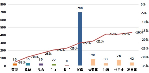 147个果实种子类品规中,价格上涨的品规占16%;降价品规占14%;价格持平的品规占70%。