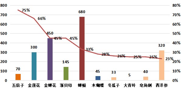 金莲花野生资源,今年产量依然不大,行情迅速拉升。金银花近阶段市场来货量大,货源走动不及产地。山银花随着价格走低,货源走销情况略有好转,但库存充足,仍需实际消化调整。菊花系列近年各地种植面积扩增,今年产出量依然不少,行情疲软下行调整。凌霄花市场走销量不大,受新货冲击价格回落。玫瑰花产新后行情高开低走,市场货源走销情况不理想。