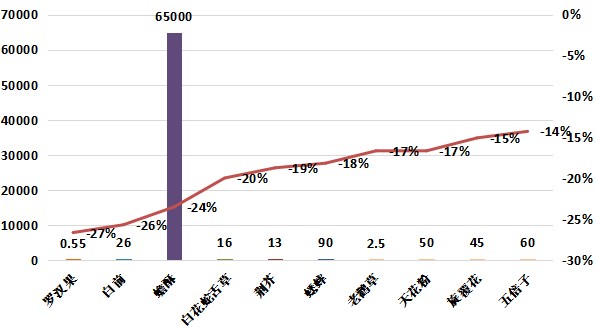 147个果实种子类品规中,价格上涨的品规占10%;降价品规占25%;价格持平的品规占65%。