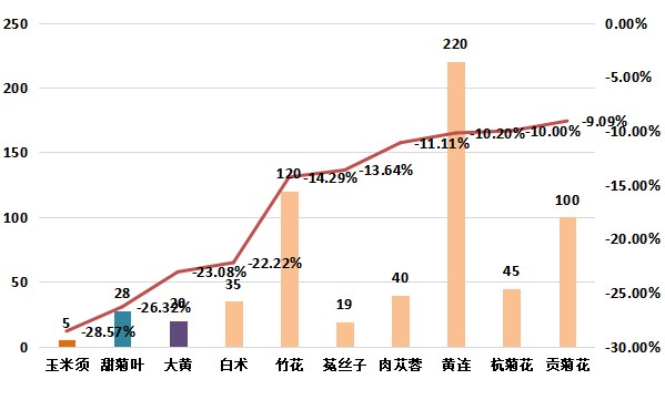 杭菊花:系列中的北京菊花已步入产新期,受近期雨水较多影响,花朵品质受到一定冲击,且含潮量高导致折干率低。目前胎菊新货正处于第一炕加工阶段,市场暂无新货上市,要价较乱。陈货38-45元,朵花陈货优质箱装货37-38元,稍次货23-25元。