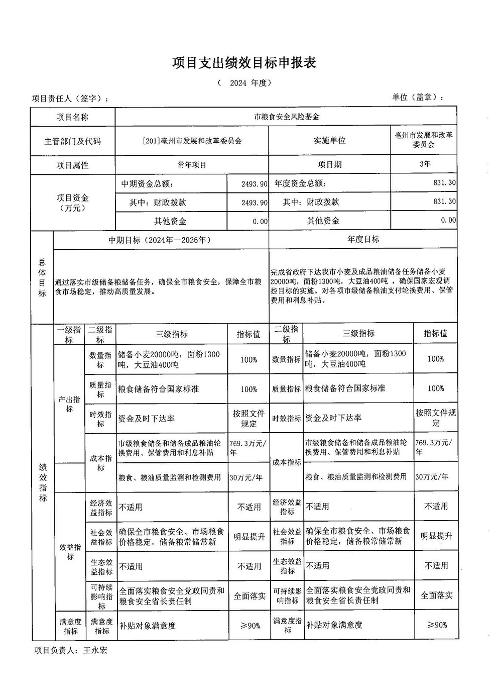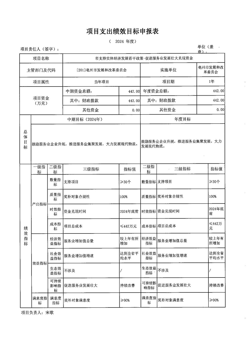 | 名称: | 亳州市发展和改革委员会2024年部门项目绩效目标-立项依据、实施主体、预算安排、绩效目标表 |